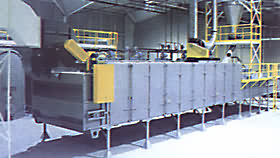 氣由專門排濕風機排出,廢氣由調節(jié)閥控制,熱氣由下往上或由上往下穿過鋪滿物料的網(wǎng)帶完成熱量與質量傳遞的進程,帶走物料水份。網(wǎng)帶緩慢移動,運行速度可